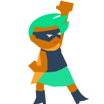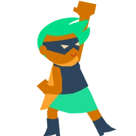 Vivian has dark skin and mint-green hair. She wears a blue shirt, boots, and superhero mask, as well as a yellow cape and a green skirt.